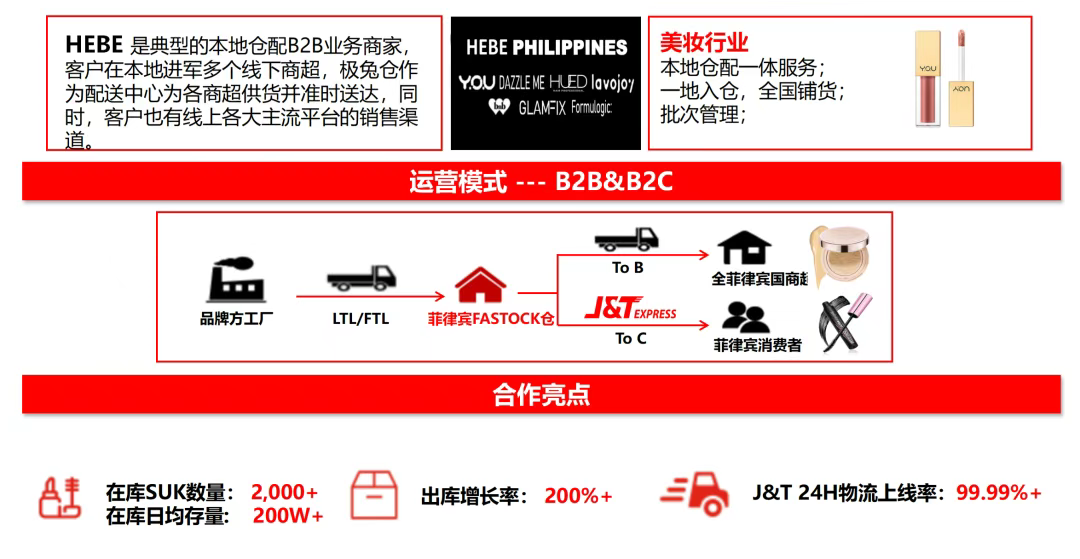 以HEBE美妆为例,这是一个典型的B2B&B2C混合业务品牌,通过入驻极兔菲律宾仓,实现了“一地入仓,全国铺货”。