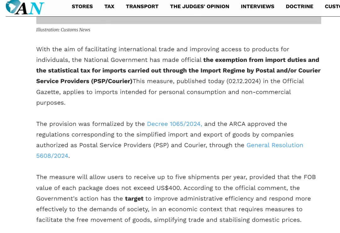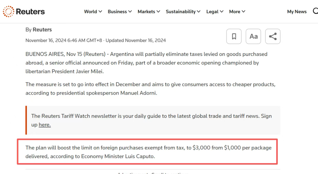 在具体措施上,阿根廷首先调整了小额跨境购物的免征门槛,取消了400美元以下个人自用进口包裹的传统关税,仅保留21%的增值税。这一变化直接削减了消费者跨境网购中占比不小的税负成本,使跨境商品在终端价格上具备更强的竞争力。