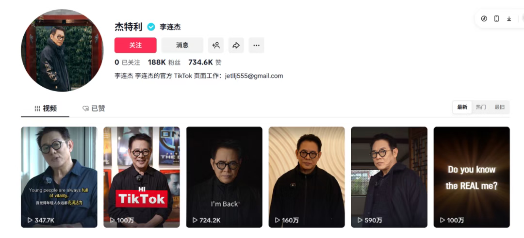 事实上,李连杰入驻TikTok并非是“空降”之举,而是早有铺垫。官宣前,其账号@JetLi已以每日一更的节奏在进行低调预热,而选择12月20日正式亮相,恰与TikTok美区内部信掀起的风波事件相近,两者之间或许不无关联。作为早年闯荡美国好莱坞的国际巨星,李连杰在美国也积累了一定的资源和信息渠道,抢先一步感知到TikTok美区动态并非难事。从昔日功夫巨星到TikTok新晋博主,李连杰的回归依然充满号召力,预热至今,其账号仅在数日内便吸引超18.8万粉丝,单条视频播放量基本在百万区间,果不其然,一代宗师“出山”,影响力依然不减当年。