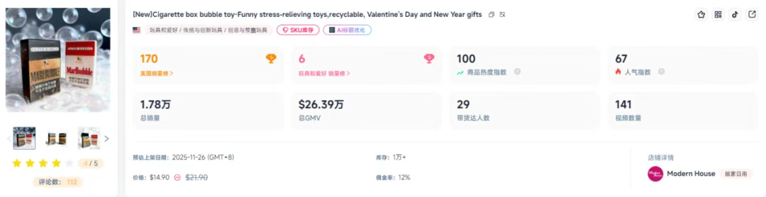 此外,泰国市场也有卖家销售,周销300多件,迄今总销量1200余件,也是11月底上架的新款。说明这款玩具本身足够亮眼,是一个不错的选品参考,卖家可借鉴其理念,用“出其不意”的功能,满足消费者潜在的物质或精神需求,以此实现业绩稳步提升。