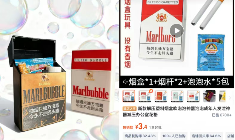 如此高人气表现,这款玩具的爆火路径值得卖家深入分析。先来看看产品特点,据介绍,这是一款模仿香烟的泡泡玩具,外形酷似香烟盒,盒里装有两根可以吹泡泡的假烟管,以及一小瓶气泡溶液。把烟管叼在嘴里,再往外吹气,就能像吐烟一样吹出泡泡,反差感拉满。