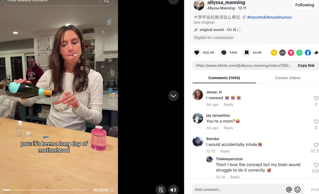 再来看营销模式,达人带货是引流关键,但成交主要集中在商品卡、橱窗等非内容场。12月11日,一位粉丝量不到1万的博主@allyssa_manning发布了一条产品视频,主题是“大学毕业后没再体验过”,意在表达工作、成家后生活太忙碌,以至于忘了如何解压。