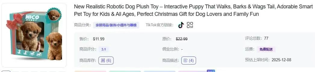 在家居用品类目,AI 带货的爆发力再次得到印证。一款机器狗玩具12月8日上架,不到20天便狂卖3.04万件,销售额达36.48万美元(约合人民币255万元),其中81%的订单由AI视频直接带动。