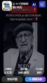美区市场的激烈竞争中,AI视频接连诞生爆款案例。其中一款保健品的AI视频上线仅11天,便实现540万播放量、5468单销量,销售额突破8.16万美元(约人民币57万)。这条视频借助AI技术塑造了一个资深且略带愤世嫉俗“智者”形象,通过制造深刻的健康危机感,精准切中美区消费者的焦虑痛点,高效激发购买意愿。