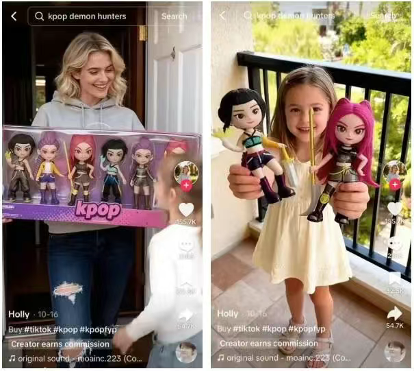 除了实物商品,虚拟周边品类也借助AI视频实现爆发。主打K-pop周边玩具的AI账号 @Holly,通过“小孩拆礼物”的AI生成场景,单条视频播放量超2400万,GMV超20万美元。