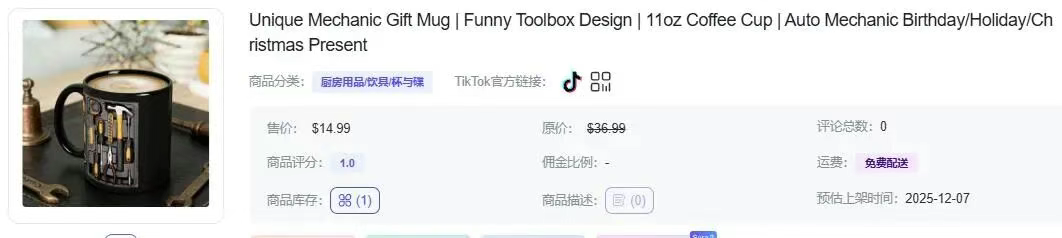另外,一款嵌入微缩维修工具的工业风咖啡杯,于12月7日上架,售价14.99美元,精准定位机械爱好者、DIY党等小众客群。通过两条AI视频展示产品细节,仅480万播放量就带动销量飙升,截至目前总销量3889单,总销售额5.83万美元(约人民币40万元)。