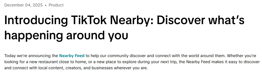 日前,TikTok在欧洲的法国、德国、意大利和英国四大市场正式推出“附近动态”(Nearby Feed)新功能。