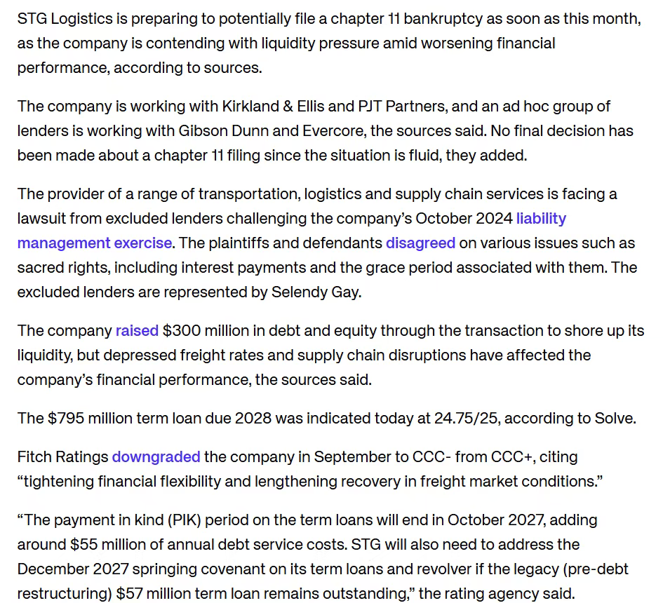 根据知情人士透露,由于经营业绩持续恶化和日益加剧的流动性压力,STG最早可能于2025年12月内提交破产保护申请。国际评级机构惠誉(Fitch)早在同年9月就已将STG的信用评级从CCC+下调至CCC-,仅比“违约”高出一个等级,并警告其“财务灵活性持续收紧”。