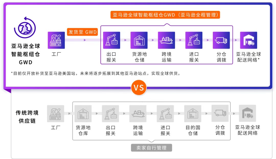 以亚马逊全球智能枢纽仓(GWD)为代表的智能仓储网络将逐步普及,“一个库存池供货全球” 的模式成为现实。卖家仅需在货源地完成入库,商品即可通过智能分拨系统快速配送至全球各地消费者手中。
