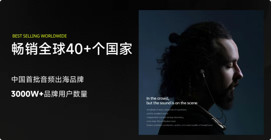2017年,产品覆盖全球超40个国家,用户突破1000万。至2023年,全球用户已突破3000万,并构建起涵盖TWS耳机、开放式耳机、电竞耳机的完整音频生态,手握50多项专利,成为国内无线音频出海的标杆之一。