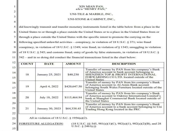 63岁美籍华人潘某及其名下的两家美国收货企业Uni-Tile&Marble,Inc.、Uni-Stone&Cabinet,Inc.;
