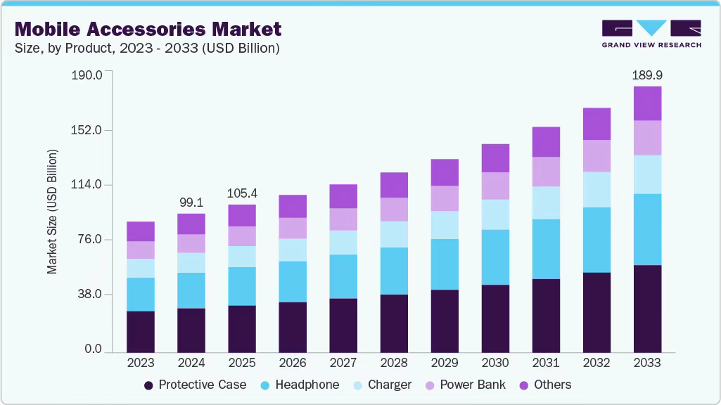 市场研究机构数据显示,全球移动配件市场本身就是一个持续增长的巨大蛋糕,预计将从2025年的约1054.5亿美元,增长至2033年的近1899.2亿美元。