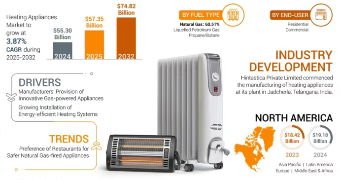 Fortune Business Insights数据显示,2024年全球供暖设备市场规模为553亿美元,预计以3.87%年复合增长到2032年达748.2亿美元。