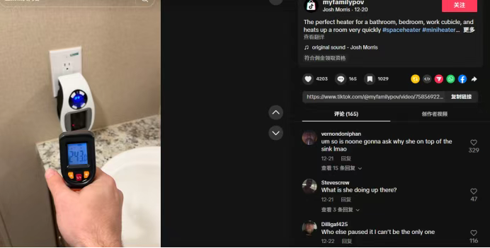 观察发现,@myfamilypov作为生活好物分享博主,经常以真实家居生活为背景,展示实用好物,12月20日的一条视频中,其冬天洗澡过于寒冷,在浴室插座上插上了便携式电暖器,不到一会,整个浴室温度上升。该视频获得180万次播放。