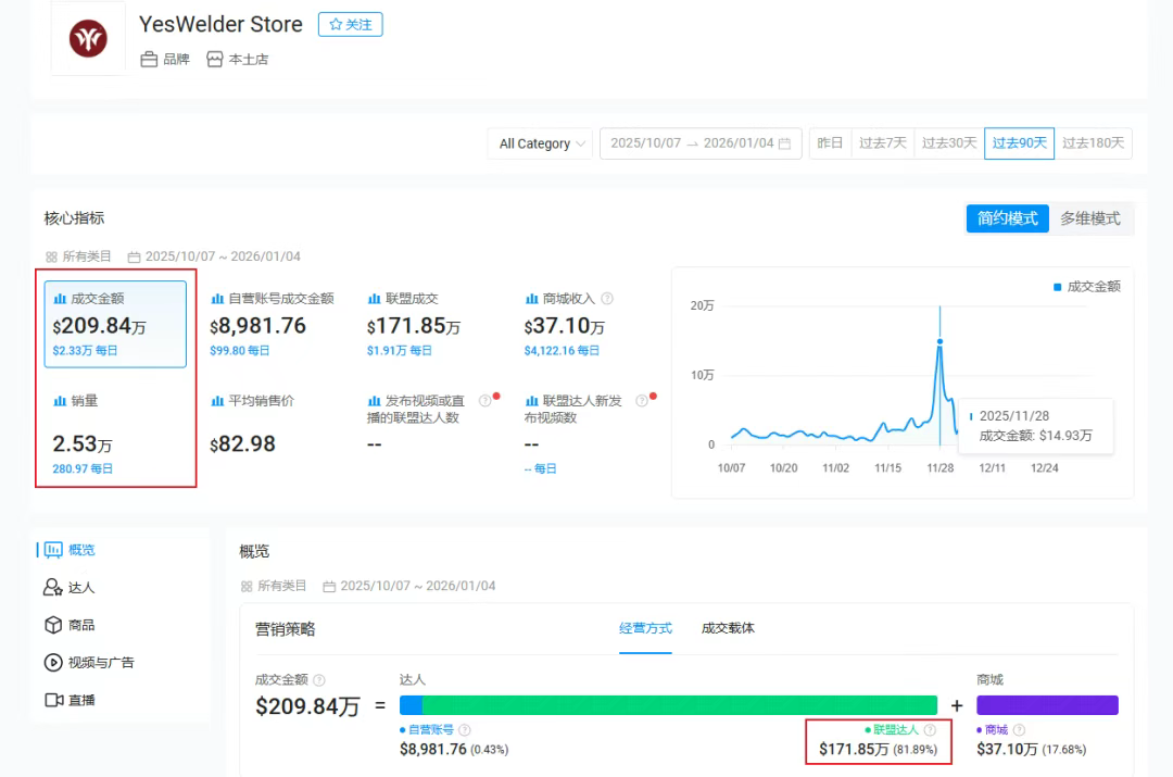 Kalodata平台的数据显示:YesWelder的美国本土小店在近3个月内累计售出商品2.53万件,总成交金额达209.84万美元。