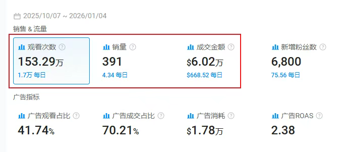 该视频最终斩获了153.29万次播放,累计带动391笔订单成交,成交金额达6.02万美元。