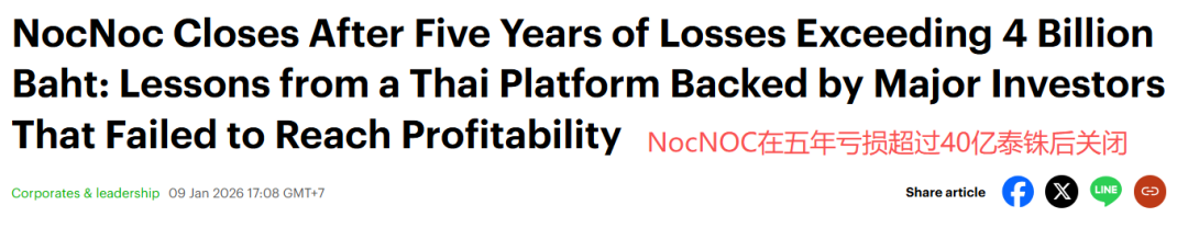 泰国电商界最近传来一声沉重的告别——本土大型电商平台NocNoc宣布将于2026年2月9日午夜起终止业务。这家被誉为“泰国最后一家大型本土电商平台”的企业,自2017年以来持续亏损,累计亏损额高达45.2亿泰铢,最终在跨国巨头的围剿下黯然离场。