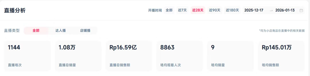 Cool-Vita累计与将近6万名带货达人进行合作,发布的带货视频超20万个,其中粉丝量在1万至5万之间的核心腰部达人,贡献了接近一半的销售额。其TikTok直播总场次已超过1000场,创造了可观的销量,场均销售额稳定在百万印尼盾级别。
