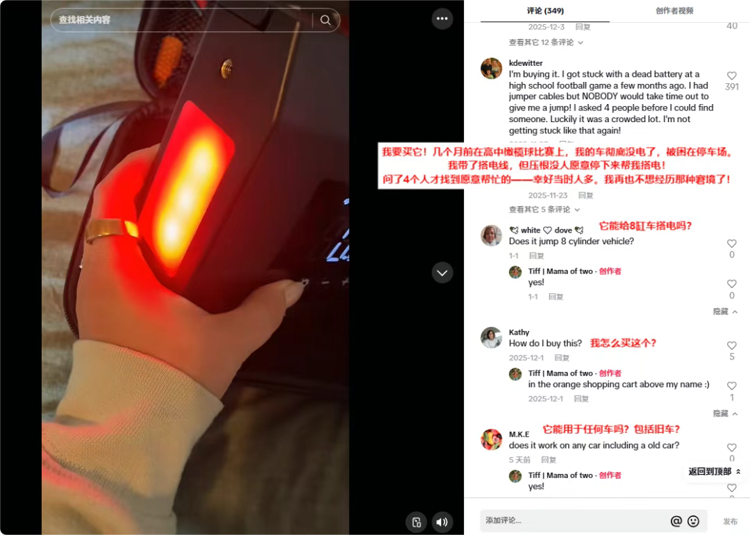 在评论区里,我们可以看到很多来自女性用户的询盘和反馈,也可以看出“汽车应急电源”的受众远不止我们所认为的特定人群,更是每一个可能遭遇车辆无法启动的普通车主、上班族、宝妈。