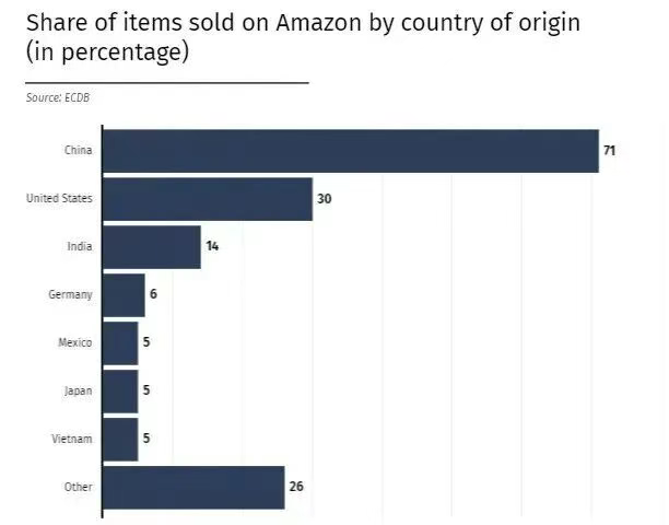 另外,ECDB的研究数据显示,在亚马逊上,超过70%的产品都是中国制造。