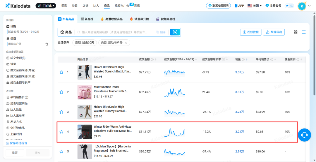 Kalodata 显示,这款 Winter Rider 保暖防风面罩于 2025 年 12 月 26 日上架,售价 9.99 美元。不到一个月时间,近 30 天成交额已经来到 31.1 万美元,累计卖出 3.2 万件,同时冲进美国 TikTok Shop「运动与户外类目销量 Top4」。