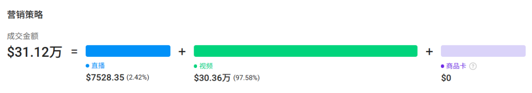 过去 30 天,商品 视频成交金额达到 30.36 万美元,而直播只贡献了 7500 美元左右,几乎可以忽略。整个商品的扩散路径,完全由短视频驱动完成。