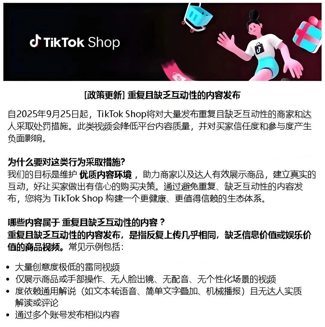 TikTok Shop给出的定义是,带着商品链接,却几乎不产生真实互动的内容。数据显示,这类视频平均停留时长通常不足3-5秒,3秒跳出率超过60%。在具体执行层面,静态图片拼接、纯文字幻灯片、商品在镜头前机械旋转展示这几种内容形式被直接点名。