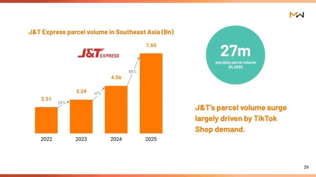 而 Momentum Works 最新研究进一步印证了东南亚电商格局的重要转折。2025年TikTok Shop在东南亚包裹配送量上首次超越 Shopee。据极兔内部估算,其配送的TikTok Shop包裹量已比Shopee旗下SPX Express高出约18%,且这一差距还在持续扩大。