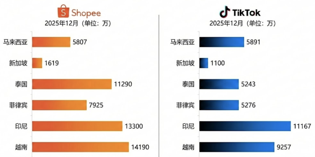 在马来西亚市场,TikTok首次实现流量反超。数据显示,2025年12月该国TikTok访问量达5891万次,小幅超过Shopee的5807万次。尽管差距仅几十万次,但这一标志性突破,预示着内容驱动的“兴趣消费”正逐步渗透货架电商主导的“刚需消费”市场,重塑区域竞争规则。
