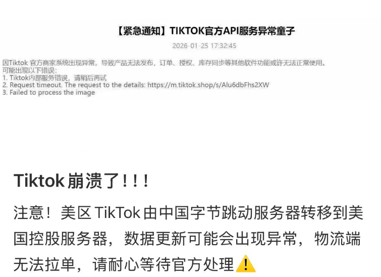 障发生约一小时后,也就是1月25日17:32,平台就向商家推送了“紧急通知”,明确此次大规模服务异常源于“TikTok官方商家系统API服务异常”,直接导致产品发布、订单处理、数据同步等核心功能中断,给卖家一个明确的故障归因。