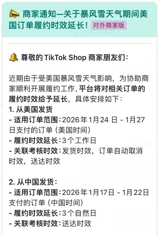 考虑到卖家的双重压力,TikTok Shop连夜发布紧急公告,调整美区订单履约时效,覆盖跨境POP商家与本土卖家,且无需主动申请——因天气原因导致的延迟发货不计入违规率,也不会触发订单量限制、结算延迟等处罚,给卖家吃了一颗“定心丸”。