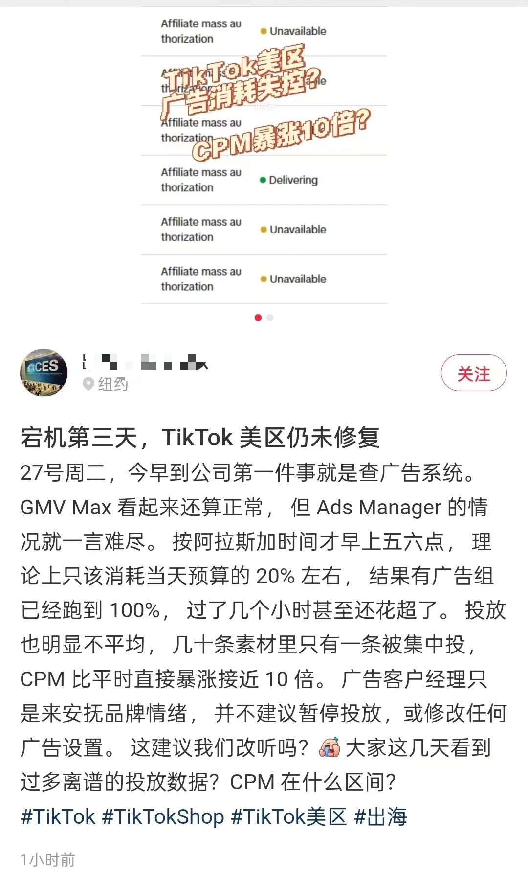 这两天,卖家们的吐槽此起彼伏,流量直接腰斩,美区销量数据至今未同步,实际销量下滑超50%;广告彻底“跑飞”,CPM单价较平日暴涨近10倍。更有甚者,单小时损失超10万元,一位美妆卖家的直播间突发“蒸发”,单场预估损失超5万美元。