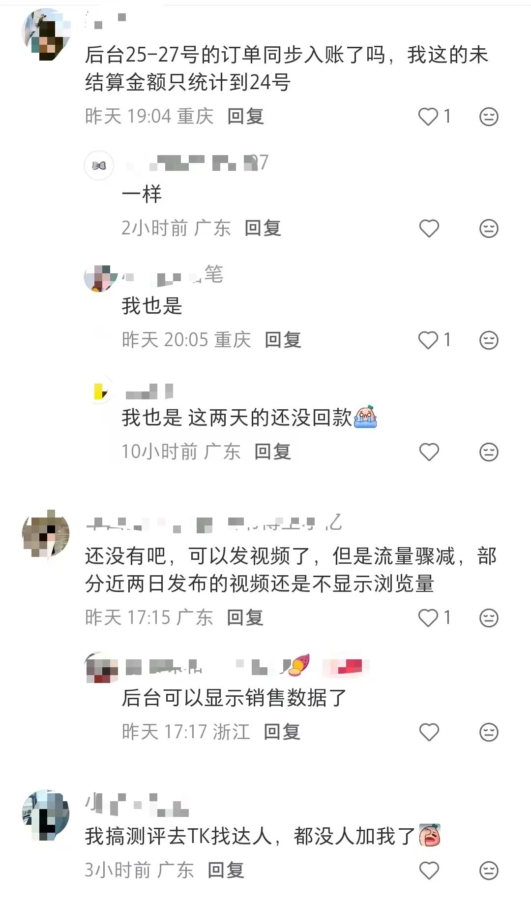 “一觉醒来美区TK视频0播放!差点以为辛苦养的号嘎了。原来是大面积系统崩溃,到现在都没完全恢复。”有卖家无奈吐槽道。