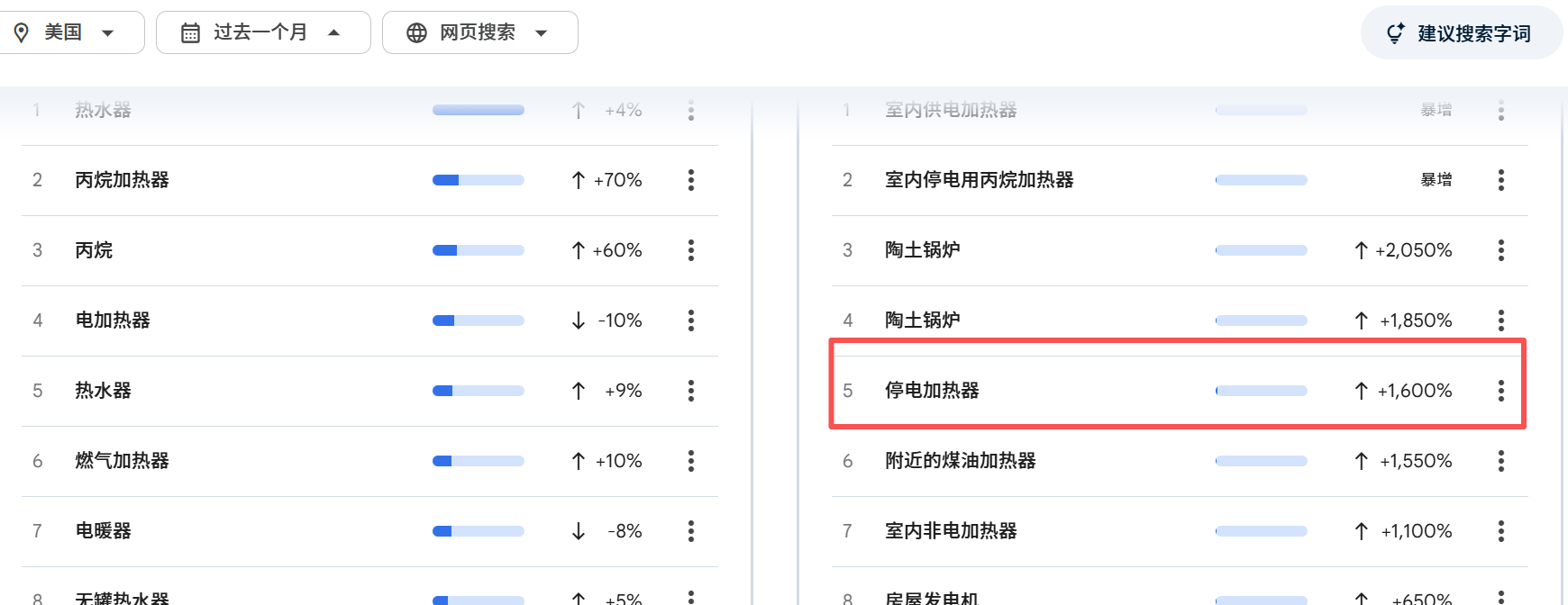 谷歌趋势的搜索数据也印证了这一市场变化:“取暖器” 关键词搜索量近日呈明显上升趋势,其中 “停电加热器” 的搜索量更是飙升1600%,刚需热度一目了然。