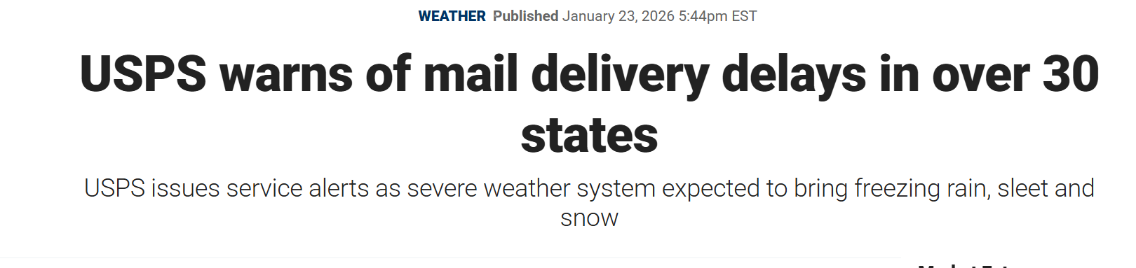 USPS早前发出警告,美国大部分地区普遍存在的冬季天气系统可能导致超过30个州的邮件投递现延迟,受影响地区包括北部平原、五大湖、中西部、俄亥俄河谷、东北部、西南部、南部平原和东南部,影响从蒙大拿州、缅因州到德克萨斯州和佐治亚州,以及华盛顿特区。