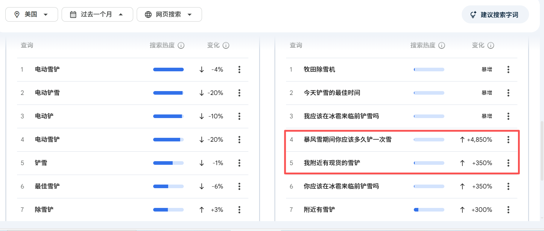 派代跨境通过Google Trends搜索发现,在美国,“暴风雪期间你多久铲一次雪”的查询量相比平日飙升了4850%。这一数据直观反映出,极端暴雪天气已深度影响美国民众的日常出行与生活,全民应对暴风雪的紧急状态也由此可见一斑。