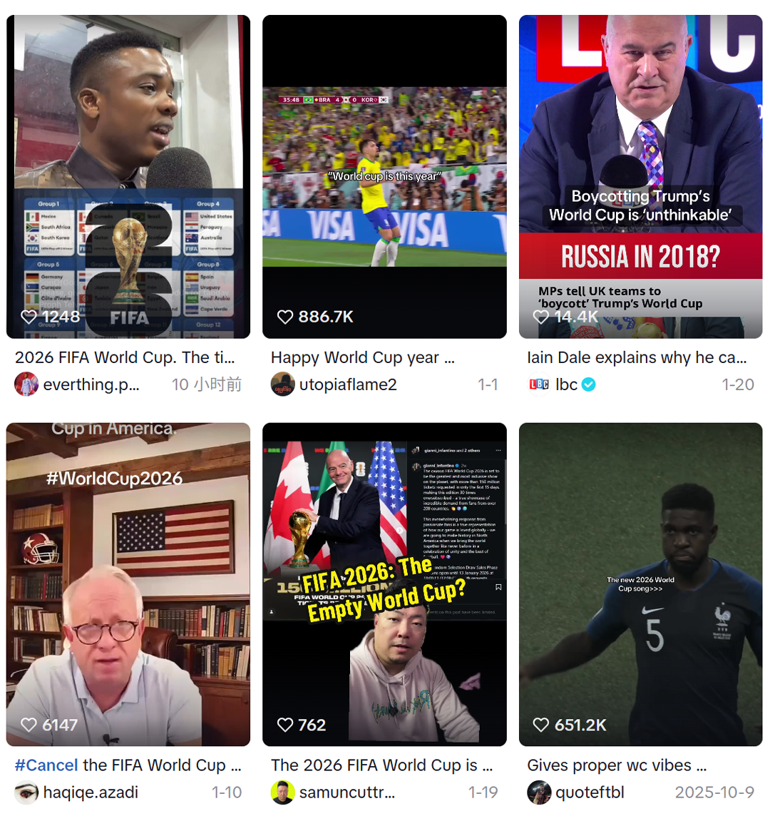 因此,从成本因素来看,2026年美加墨世界杯选择三国联办模式本质上是为了“节流”,通过成本公摊来缓解单个国家举办的成本压力。而TikTok的核心作用在于“开源”——借助其覆盖全球10亿+用户的流量底盘,触达当前传统渠道难以覆盖的年轻球迷群体以及女性观众,将线上流量热度转化为线下消费、赛事收视等实际收益。
