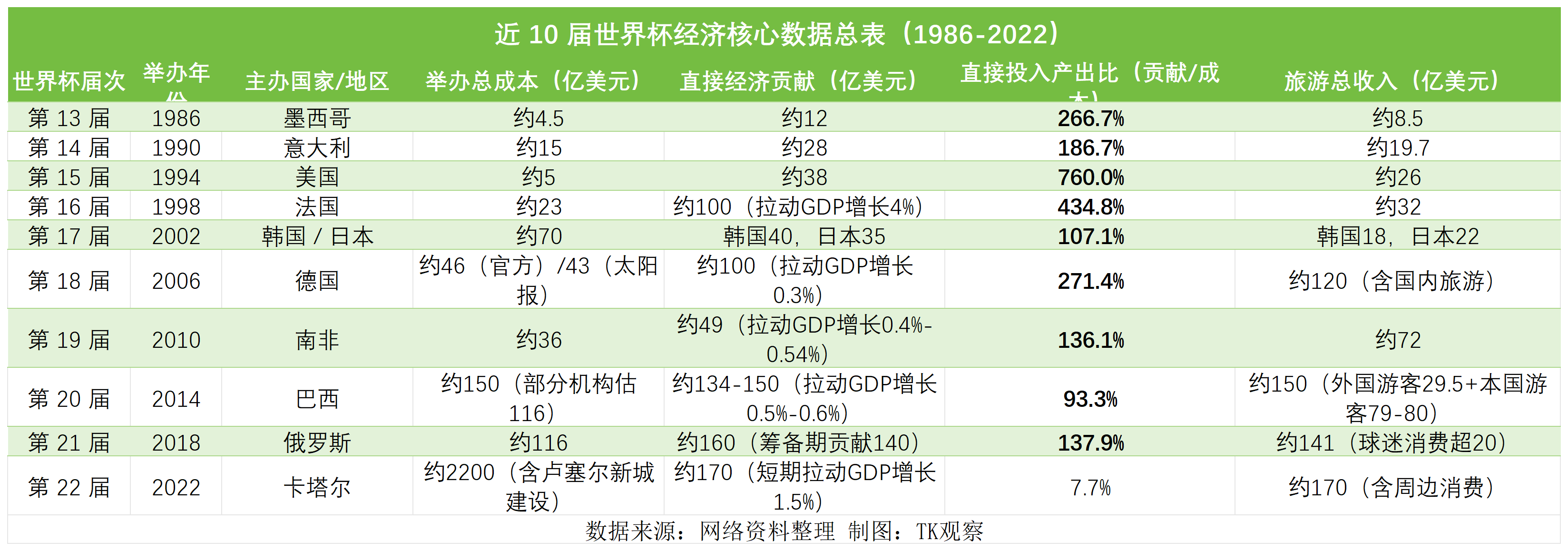 回顾近10届世界杯经济发展轨迹,可以发现赛事直接经济贡献与成本之间存在失衡,前者自第十六届世界杯赛后,长期维持在百亿美元区间,而举办成本却呈逐届攀升的态势。特别是2022年卡塔尔世界杯因超大规模基建甚至创下2200亿美元的历史纪录。正是这个关键指标的失衡导致了世界杯赛事经济投入产出比无法复制出1994年美国世界杯760%的高回报神话。