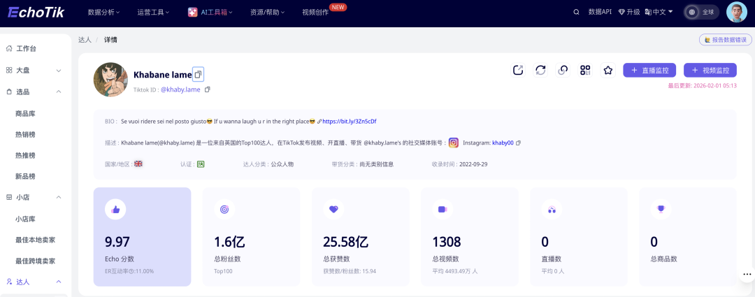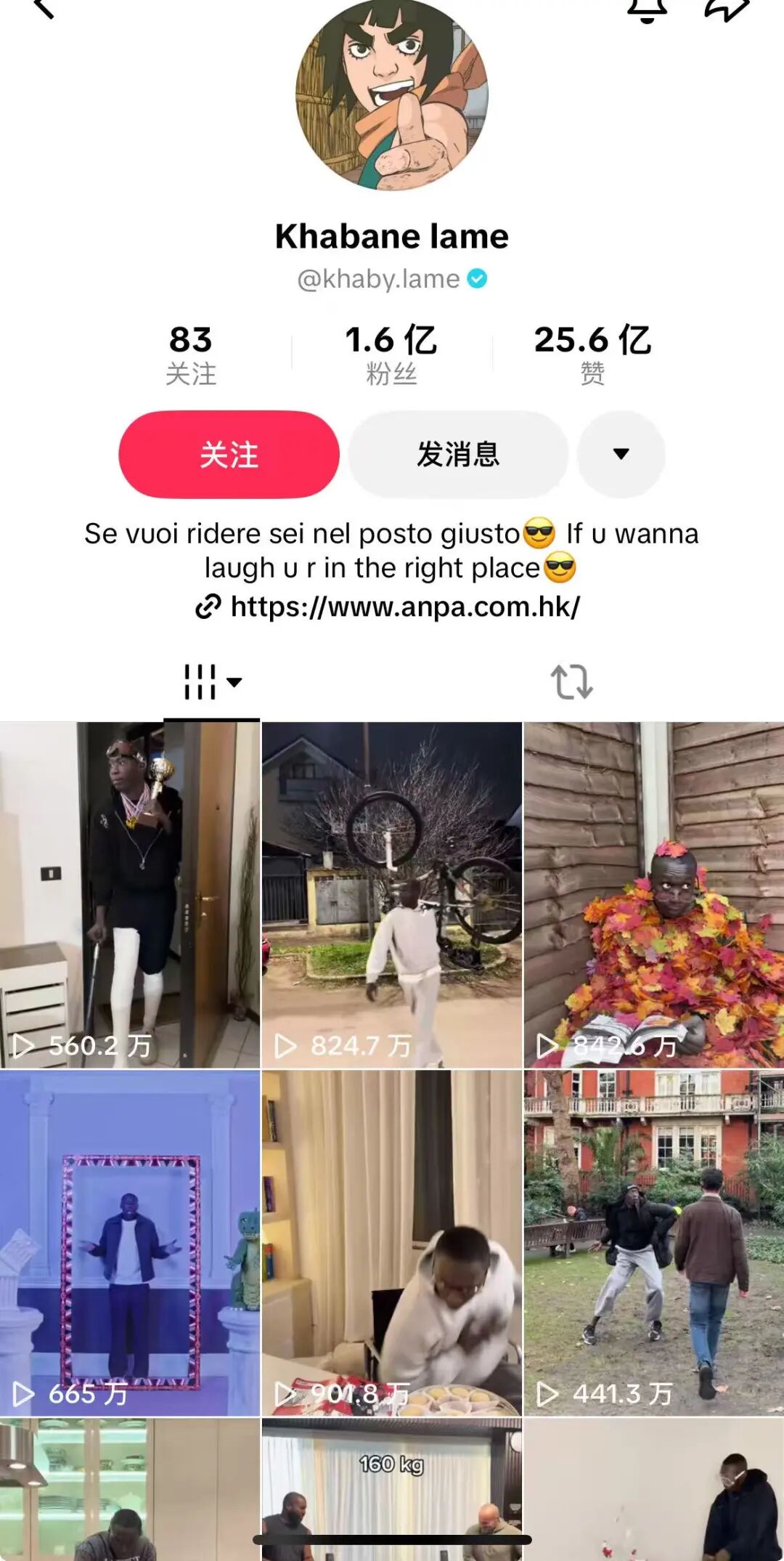 据Echotik数据显示,Khabane lame(@khaby.lame),截至 2026 年初,他在 TikTok 上的粉丝量稳居全球第一(约 1.6 亿),全网总粉丝量超过 3.6 亿。