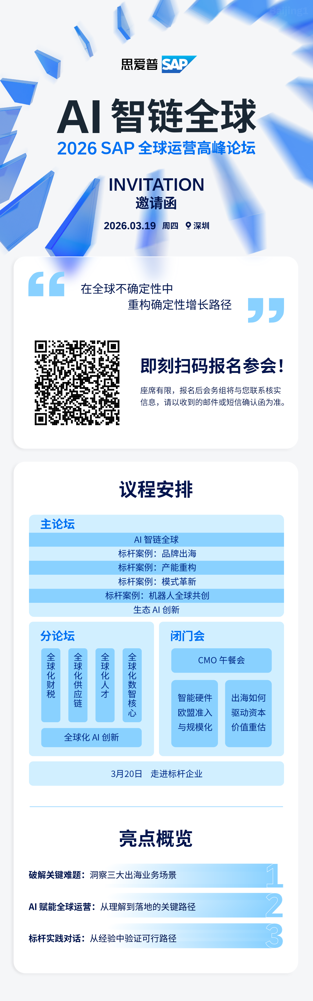 【活动报名 | 深圳】AI智链全球——2026SAP全球运营高峰论坛(2026.3.19周四)