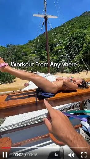 视频场景更是加分项,阳光甲板、海滩绿植构成的松弛感背景,搭配博主姣好的体态示范,既弱化了健身的枯燥感,又强化了产品“随时随地锻炼”的核心卖点,完美契合上班族、宝妈、学生等时间碎片化人群的健身需求。