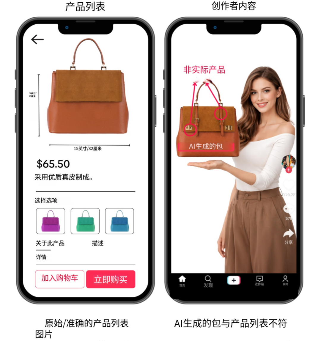 AI生成的产品视觉必须与真实产品和商品信息相匹配(例如颜色、尺寸、材质、特征、设计、形状和重量)。