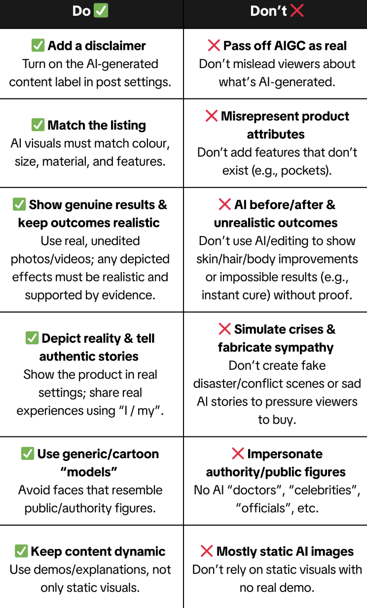 不能将 AI 生成的内容伪装成真实拍摄的素材,这是平台严厉打击的欺诈行为。不得误导产品属性不能为产品添加不存在的功能或设计,比如给没有口袋的商品 AI 生成出口袋。不得展示虚假前后对比不能用 AI 虚构皮肤、头发或身体的 “即时改善” 效果,除非有真实的证据支撑。不得制造虚假危机不能用 AI 编造灾难、冲突等悲伤场景来博取同情、强迫用户购买。不得仿冒权威 / 公众人物禁止用 AI 生成医生、名人、官员等形象,避免引发信任危机与法律风险。不得过度依赖静态 AI 图像不能仅靠没有真实演示的静态视觉内容来推广产品,这会降低内容的可信度。