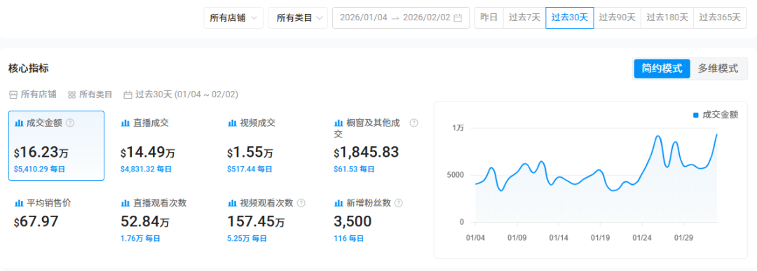 根据数据,在过去30天,马来西亚账号@70maimy一共达成成交额16.23万美元,其中有14.49万美元来自直播,占比高达89%。