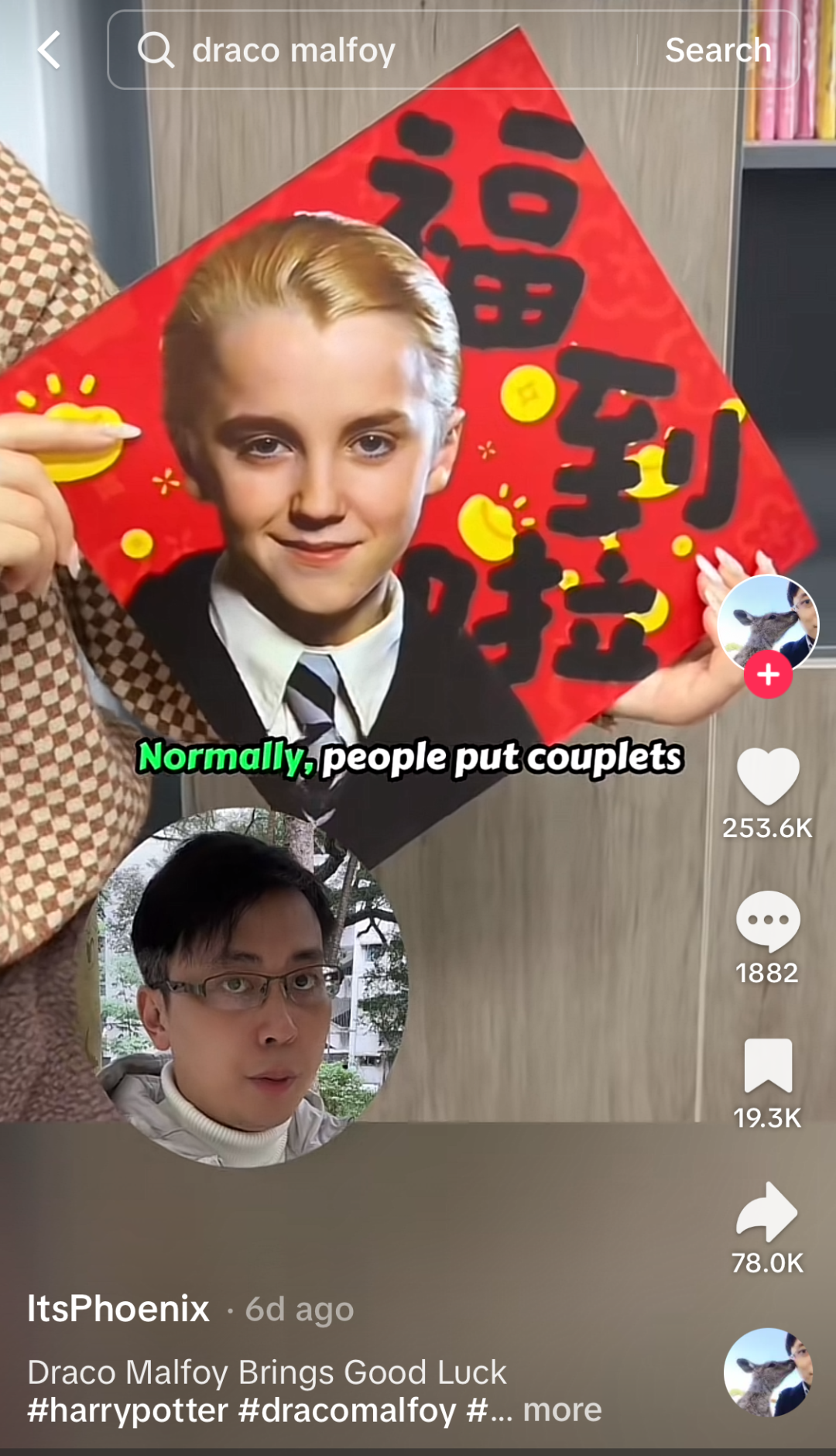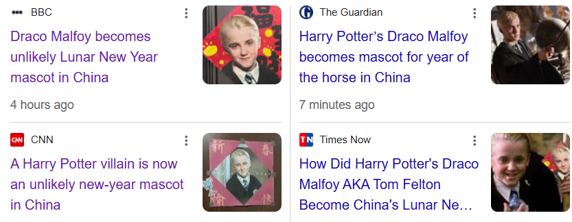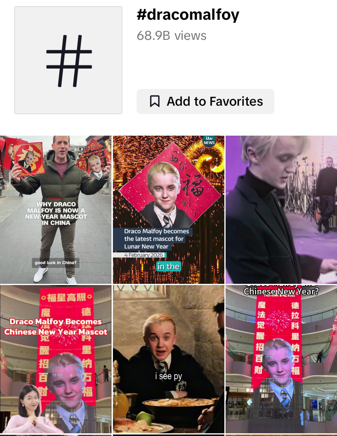 当地时间2月3日,马尔福的饰演者、英国演员汤姆・费尔顿(Tom Felton)在自己的 Instagram 限时动态中,转发了一张来自中国河南商丘的网图 —— 当地一家商场的巨型屏幕上,正醒目地播放着带有马尔福形象的春联。他还俏皮地配文:“德拉科・马尔福意外成了中国春节的吉祥物。”