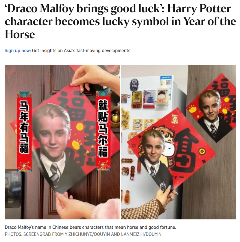 名字取得好,反派变主角。《哈利・波特》中高冷的纯血反派德拉科・马尔福,会以这样一种意想不到的方式,成为中国马年春节的“新晋吉祥物”。这股由网友自发掀起的玩梗热潮,不仅点燃了国内社交圈,更跨洋出海在海外引发了现象级关注。