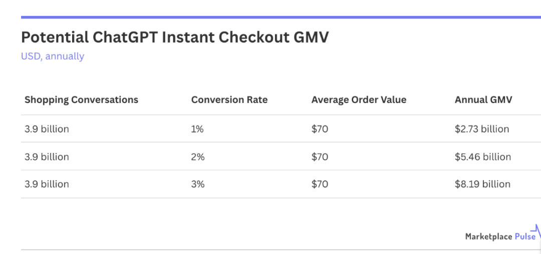 在此基础上,即便采用保守的转化假设,即仅2%的商品相关对话促成实际购买且平均客单价为70美元,也能创造55亿美元的年度GMV(商品交易总额),这一规模约为手工艺品电商平台Etsy全球市场交易总额的一半。