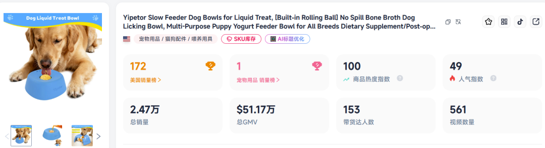 一只专为狗狗设计的液体零食碗,在美国TikTok上卖出2.47万件、销售额突破51万美元,产品迅速售罄,成为平台宠物用品销量榜首。