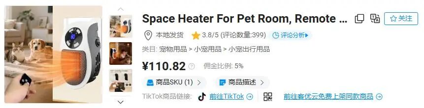 一款迷你宠物取暖器在TikTok美区单月销售额近100万元,成功跻身当地宠物用品类目热销榜单。TKFFF发现,该产品凭借场景化营销实现跨类目突破,先是依托浴室场景打开家用取暖市场,转战宠物类目后,依旧保持着亮眼的销售成绩。