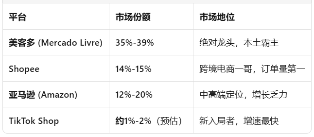 在TikTok Shop进入巴西做电商之前,这里长期呈现“三足鼎立”格局,有深耕多年的地头蛇美客多,早已在此安营扎寨的过江龙Shopee,还有虎视眈眈的亚马逊。